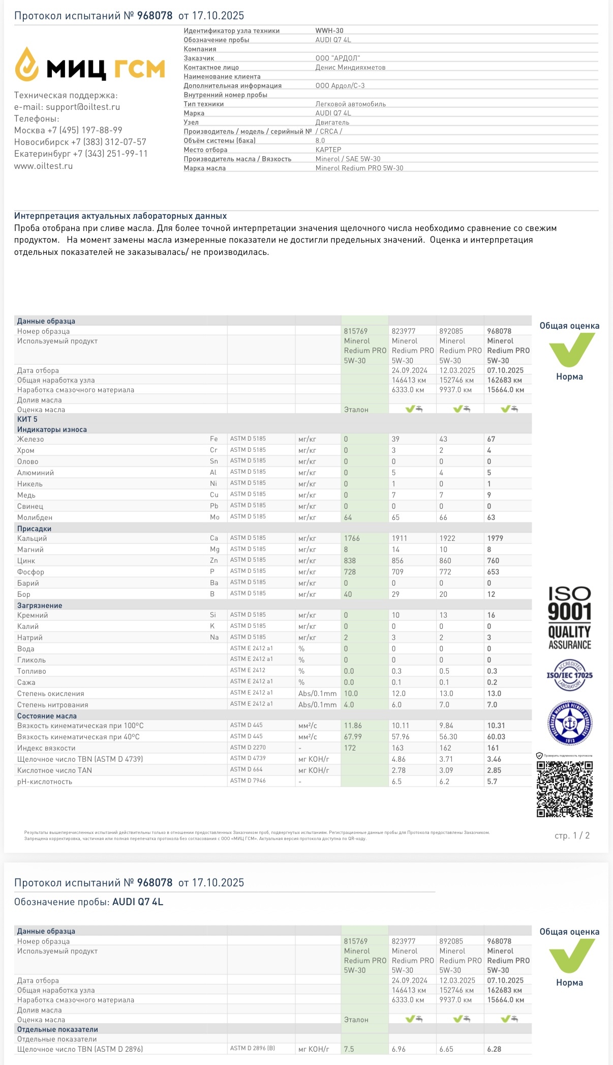«Для нас и наших клиентов важно постоянно подтверждать качество наших продуктов не только лабораторными испытаниями, но и практическими результатами в реальных условиях эксплуатации. Тест на Audi Q7 3.0 TDI показал, что MINEROL REDIUM PRO SAE 5W-30 сохраняет свои защитные свойства и стабильность на протяжении всего цикла, что подтверждает готовность нашего масла к увеличенным интервалам замены и суровым российским условиям, — отметил Артем Петросян, руководитель отдела продаж MINEROL.